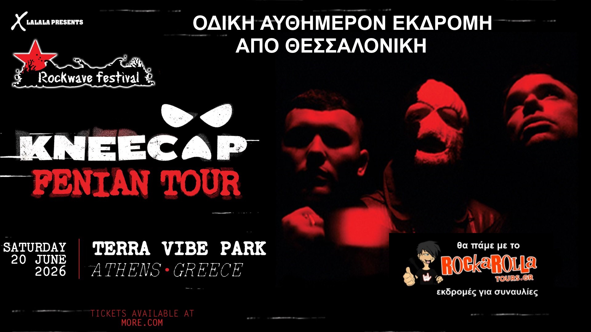 Οδική αυθημερόν εκδρομή από Θεσσαλονίκη για την συναυλία των Kneecap στην Αθήνα το Σάββατο 20 Ιουνίου 2026, στο Rockwave Festival (Terra Vibe, Μαλακάσα).